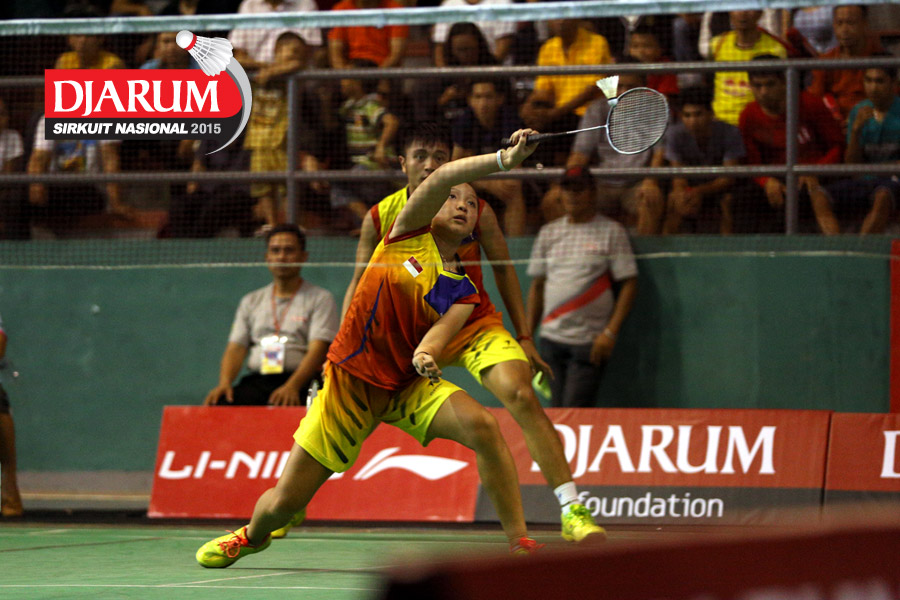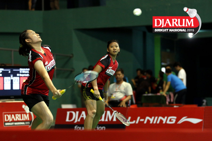 Cynthia Shara/Rofahadah Supriadi (Djarum Kudus) mengembalikan shuttlecock ke arah Felicia Parmenas/Tutut Novi (Djarum Kudus).