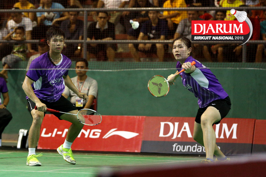 Kevin Ezra/Angelica Wiratama (Exist) mengembalikan shuttlecock ke arah Zachariah Joshiano/Winny Oktavina (Tangkas).