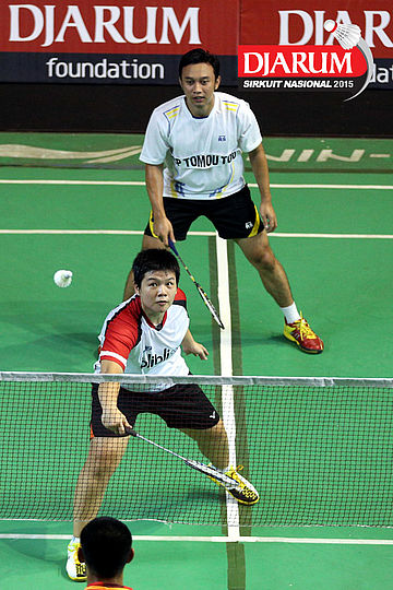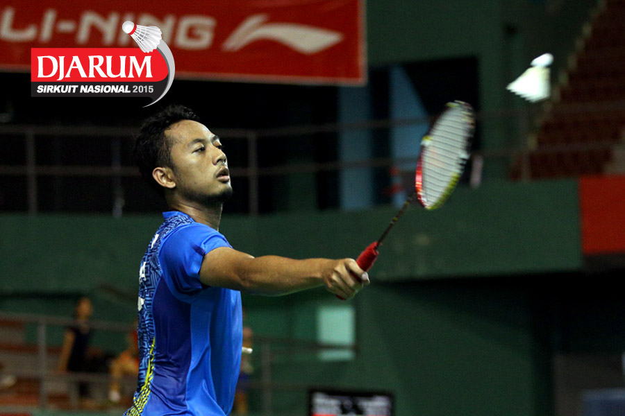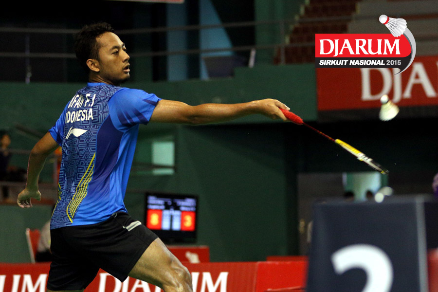 Rifan Fauzin (Pelita Bakrie) mengembalikan shuttlecock ke arah Alvindo Saputra (Tangkas).