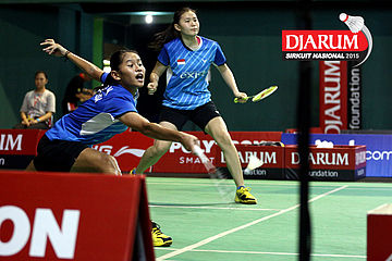 Febriana Dwipuji/Ribka Sugiarto (Djarum Kudus) bersiap menyambar pengembalian dari Aisyah Nuraini/Angelica Wiratama (Exist).