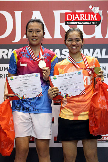Juara dua tunggal dewasa putri, Vehrenica Debora (kiri) dan juara satu tunggal dewasa putri, Febby Angguni (kanan).