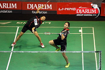 Trikusuma Wardhana/Meiliana Jauhari (Suryanaga/Djarum Kudus) menyambut pengembalian dari Ardiansyah Putra/Devi Tika Permatasari (Berkat Abadi).