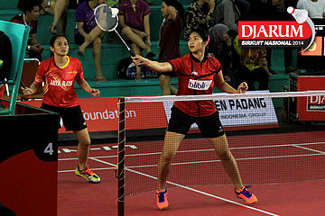 Della Augustia/Ristya Ayu (Djarum Kudus) mengembalikan shuttlecock ke arah Nana Hidayati/Rani Wahyuni (PBSI Bukit Tinggi)