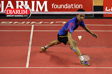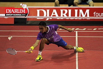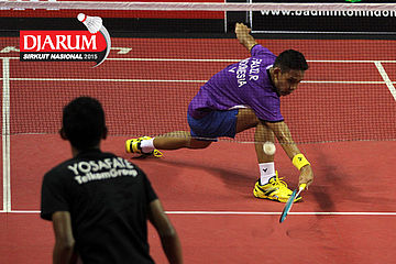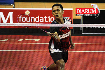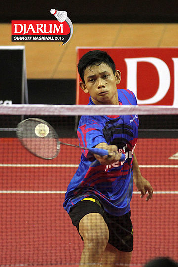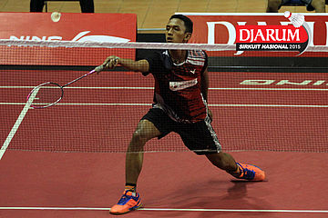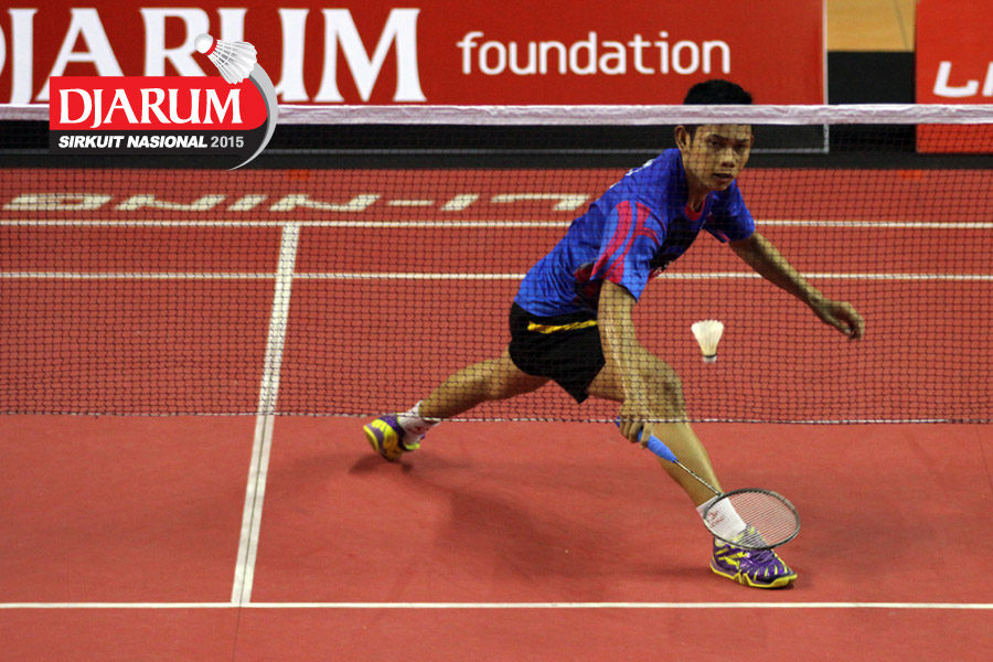 Robin Chandra (Jaya Raya) mengembalikan shuttlecock ke arah Chico Aura (Exist)
