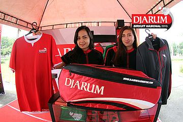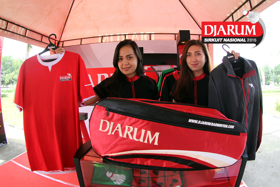 Dua usher saat memamerkan beberapa produk merchandise Djarum Sirkuit Nasional