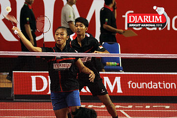Galang Decky/Vania Arianti (Djarum Kudus) menyambar pengembalian dari Andrean Syahputra/Amalia Meutia (Sejahtera Lampung)