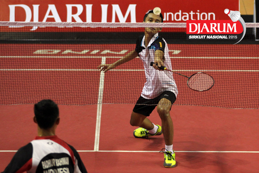 Yosafat Efraim (Pusdiklat Telkom Jabar) mengembalikan shuttlecock ke arah Fauzi Ramadhan (Exist)