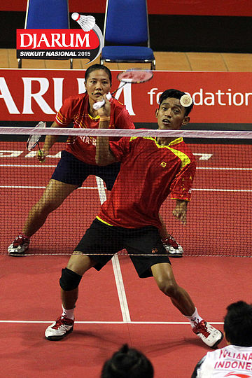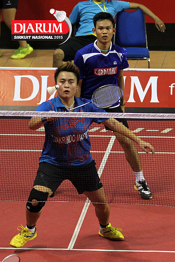Ragawa Tamasuta/Berliyan Sudrajat (Semen Gresik) mengembalikan shuttlecock ke arah Muhammad/Ganis Nurrahmandani (Pertamina Fastron)