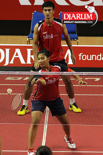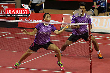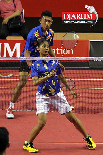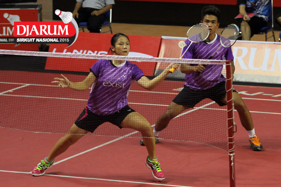 Ridho Akbar/Ery Octaviani (Halim/Jaya Raya) bersiap menghadang serangan yang dilepaskan Kaisar Bobby/Delis Yuliana (Anugrah Jakarta)