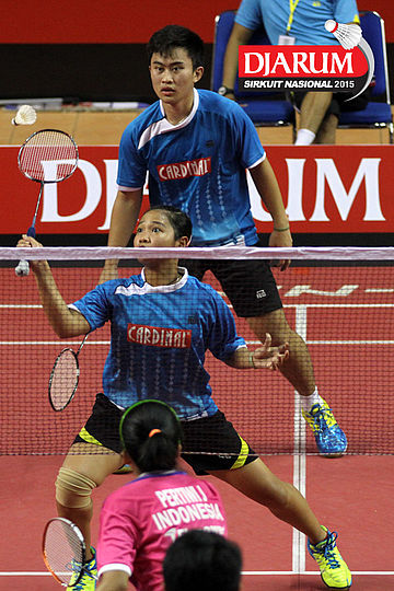 Reinard Dhanriano/Sinta Arum (Mutiara Cardinal) bersiap menyambar pengembalian dari Christofel Karinda/Jessica Pertiwi (Mentari V-Kool)