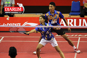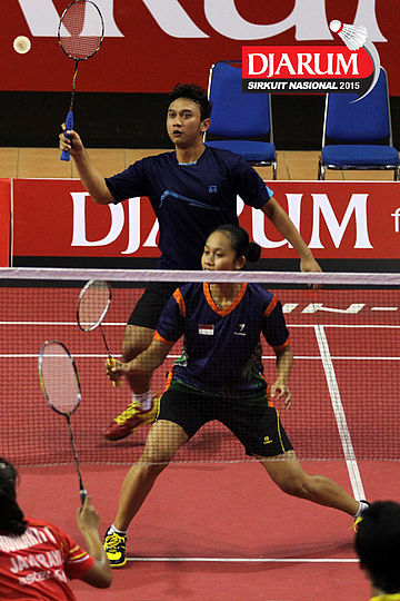 Tri Kusuma Wardhana/Aprilia Yuswandari (Jaya Raya Suryanaga/Semen Gresik) bersiap menyambut pengembalian dari M. Alfian Firsada/Aris Budiharti (Jaya Raya)
