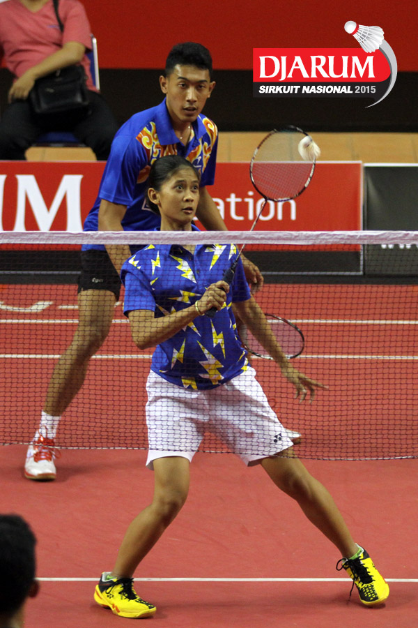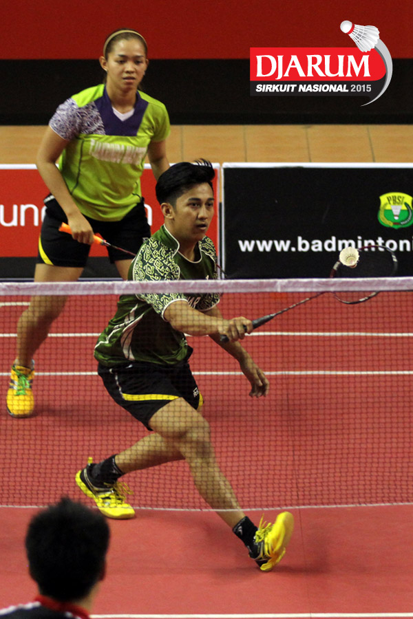Rendra Wijaya/Meiliana Jauhari (Djarum Kudus) menghadang serangan dari Rizko Azuro/Febby Angguni (Guna Dharma/Tjakrindo Masters)