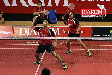 Akbar Bintang/Ristya Ayu (DJarum Kudus) bersiap menyambar pengembalian dari Stefan Indra/Variella Aprilsasi (Mutiara Cardinal/Tjakrindo Masters)