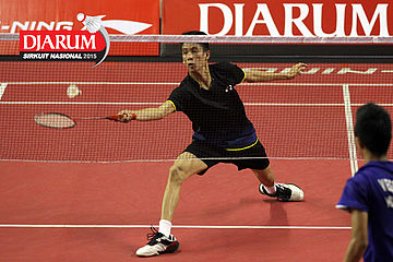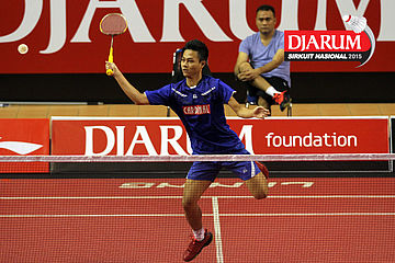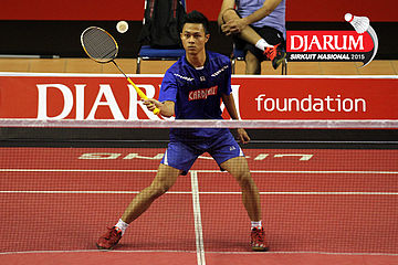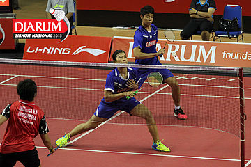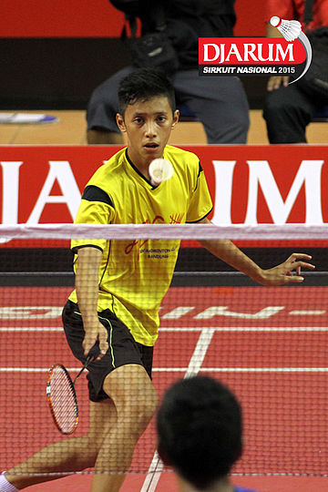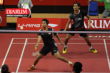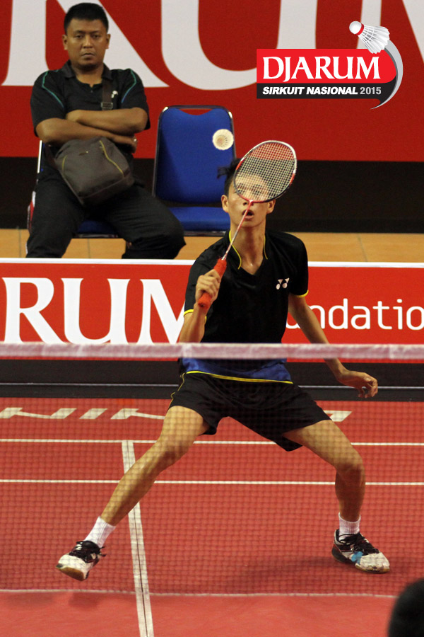 A. Rahmat Kurniawan (SGS PLN) mengembalikan shuttlecock ke arah Vega Vio (Mutiara Cardinal)