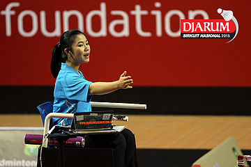 Beno Drajat/Yulfira Barkah (Mutiara Cardinal) bersiap menyambut pengembalian dari Komadani Maytri/Angelina Natasha (Jaya Raya Suryanaga/Semen Gresik)