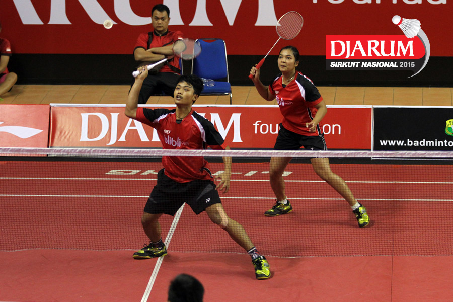 Kaisar Bobby/Delis Yuliana (Anugrah Jakarta) mengembalikan shuttlecock ke arah Ridho Akbar/Ery Octaviani (Halim/Jaya Raya)