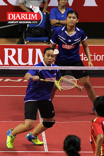Dianita Saraswati/Yulfira Barkah (Mutiara Cardinal) bersiap menyambut pengembalian dari Cynthia Shara/Rofahadah Supriadi (Djarum Kudus)