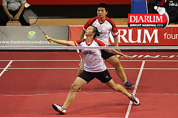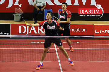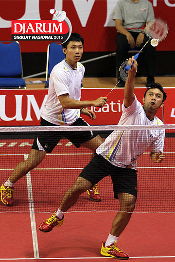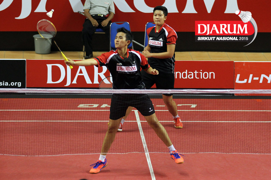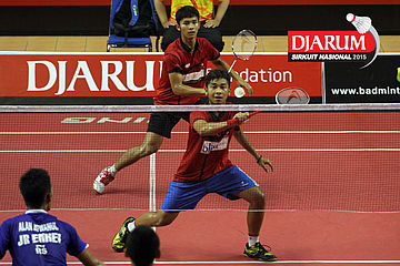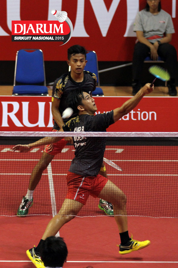 Ardy Nugroho/Devand Riefky (Djarum Kudus) bersiap menyambut pengembalian dari Alan Muhammad/M. Rizky (JR Enkei)