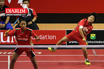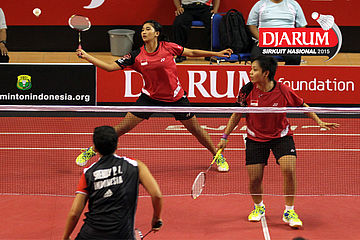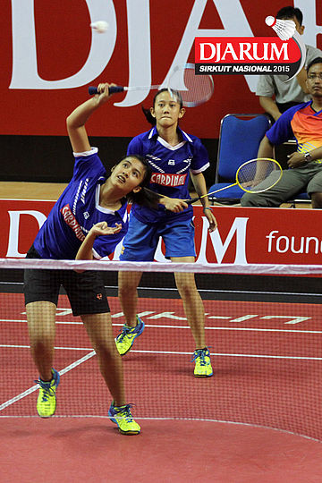 Cynthia Shara/Rofahadah Supriadi (Djarum Kudus) melepaskan smash ke arah Dianita Saraswati/Yulfira Barkah (Mutiara Cardinal)