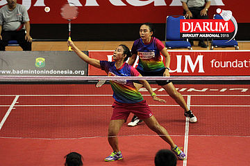 Jauza Fadhila/Apriyani Rahayu (Pelatprov PBSI DKI Jakarta) bersiap meyambut pengembalian dari Shendy Puspa/Vita Marissa (Djarum Kudus)