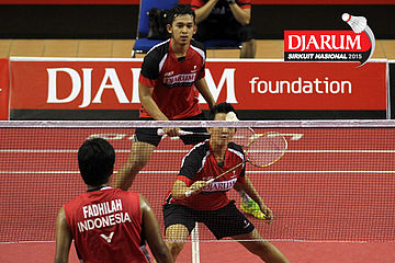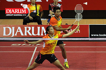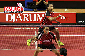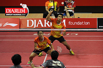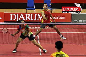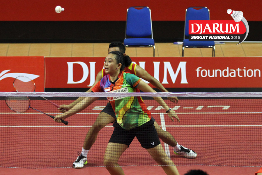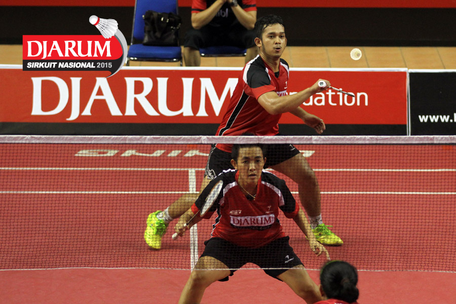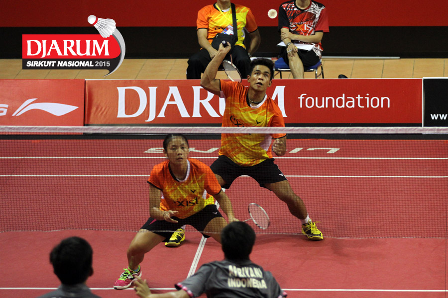 Jeka Wiratama/Vita Marissa (Djarum Kudus) bersiap menghadang serangan dari Irfan Fadhillah/Weni Anggraini (Jaya Raya)