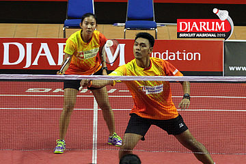 Irfan Fadhillah/Weni Anggraini (Jaya Raya) bersiap menyambut pengembalian dari Jeka Wiratama/Vita Marissa (Djarum Kudus)