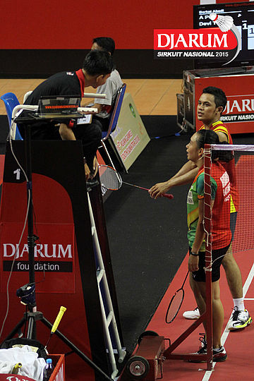 Rizky Hidayat/Keshya Nurvita Hanadia (Hi Qua Wima/Berkat Abadi) saat melakukan protes kepada wasit