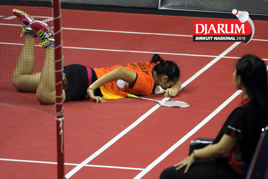 Brigita Marcelia (Exist) harus terjatuh saat berupaya menghadang serangan-serangan yang dilepaskan pasangan Fauzi Habibi/Apriyani Rahayu (Pelatprov PBSI DKI Jakarta)