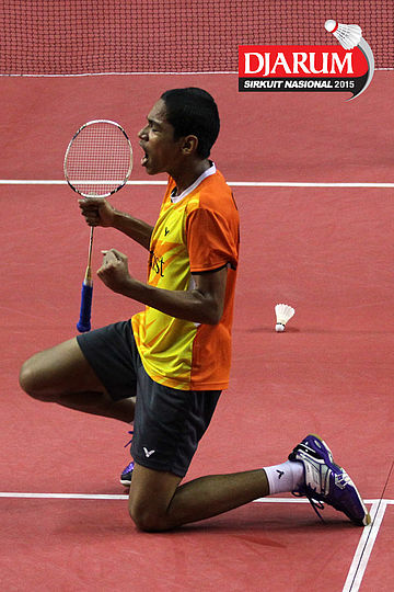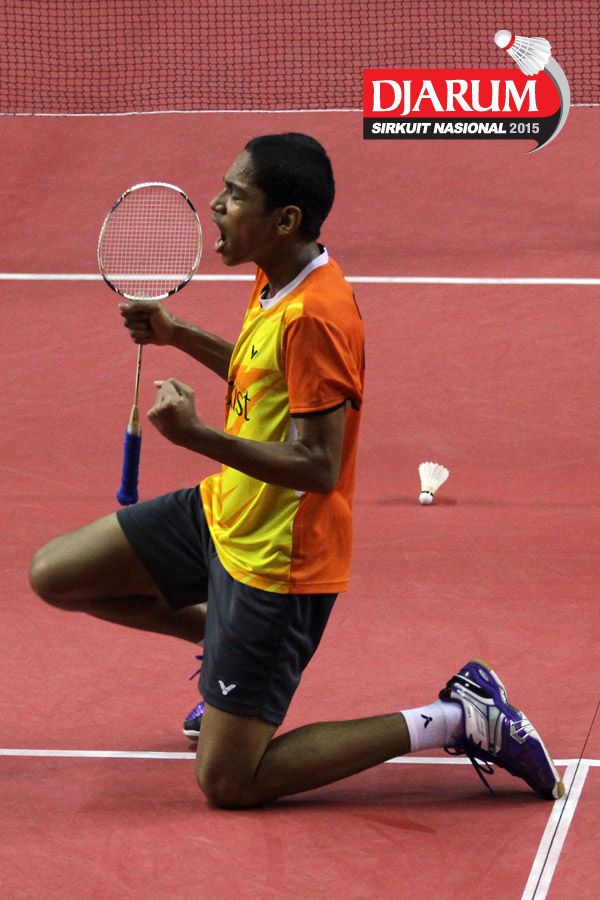 Selebrasi Chico Aura (Exsit) setelah berhasil memastikan diri menjadi juara di nomor tunggal taruna putra Djarum Sirkuit Nasional Li-Ning Sumatera Selatan Open 2015