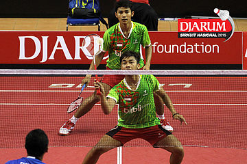 Ardy Nugroho/Devand Riefky (Djarum Kudus) bersiap menyambut pengembalian dari Farkhan Pandu/Yanuar Wahyu (Exist)