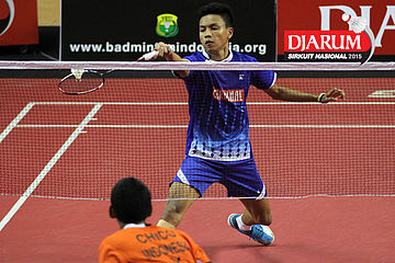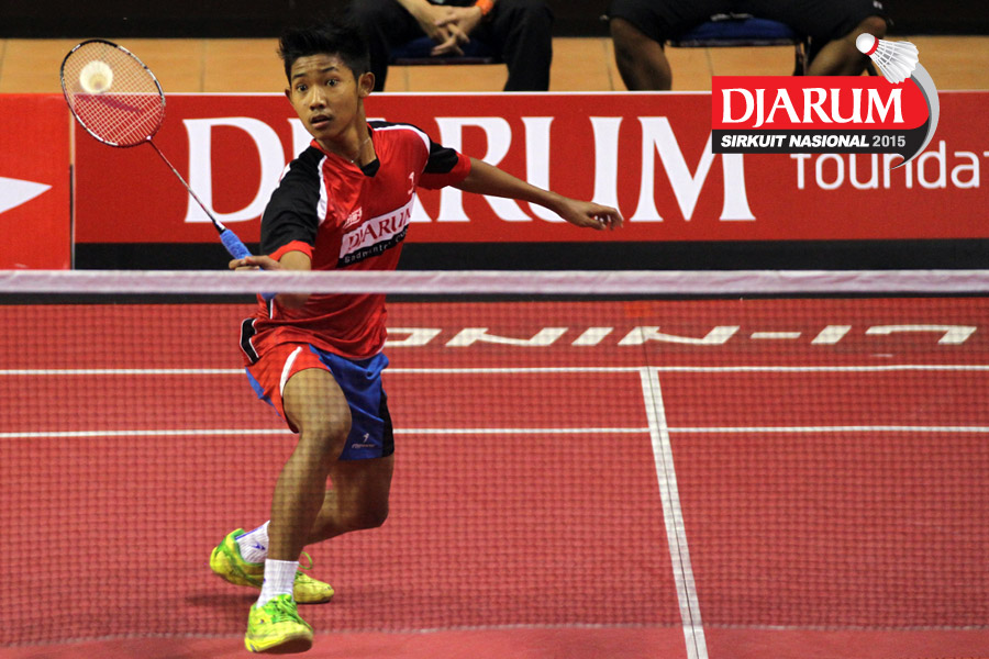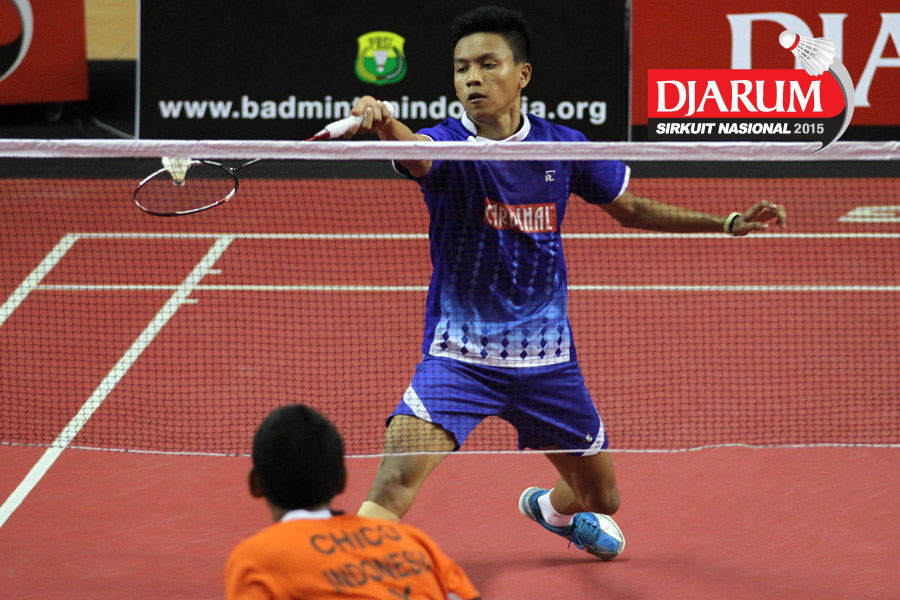 M. Lutfi Erlangga (Mutiara Cardinal) mengembalikan shuttlecock ke arah Chico Aura (Exsit)
