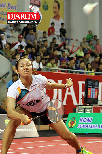 Aprilia Yuswandari (Semen Gresik) menyambut pengembalian dari Febby Angguni (Tjakrindo Masters)