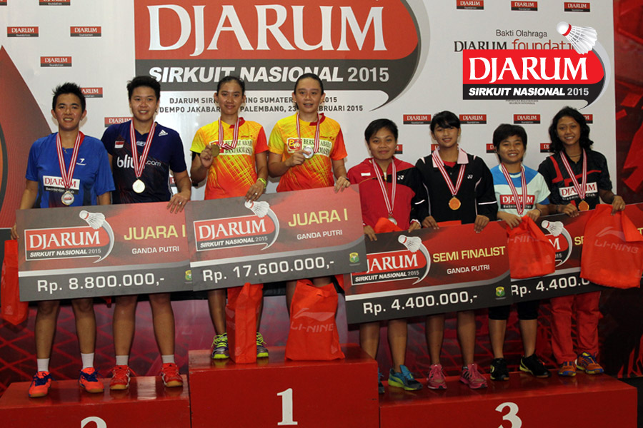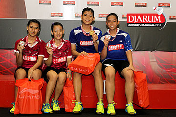 Shendy Puspa/Vita Marissa (Djarum Kudus) berhasil menghadang serangan yang dilepaskan Devi Tika Permatasari/Keshya Nurvita Hanadia (Berkat Abadi)