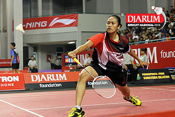 Febby Angguni (Tjakrindo Masters) mengembalikan shuttlecock ke arah Aprilia Yuswandari (Semen Gresik)