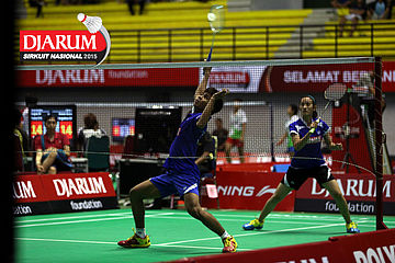 Haffiz Nur/Mia Dian (Djarum Kudus) mengembalikan shuttlecock.