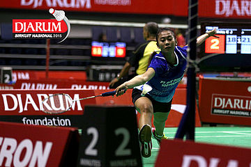 Aprodhita Charolina (PBSI DIY) melepaskan serangan.