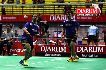 Markis Kido/Pia Zebadiah (Jaya Raya) mengembalikan shuttlecock.