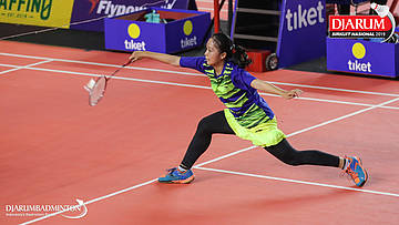 Angelica Febriana Timporok (Mutiara Cardinal, Bandung) bersiap menyambut shuttlecock