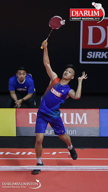 Yudha Putra Pramudia (Mutiara Cardinal, Bandung) menyambut shuttlecock