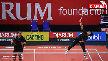 Elok Machsunnah+Muzammil Elya Tantri (Pratama Badminton Academy, Sby) menyambar pengembalian