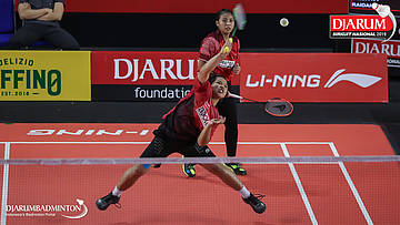 Elok Machsunnah+Muzammil Elya Tantri (Pratama Badminton Academy, Sby) bersiap melepaskan serangan