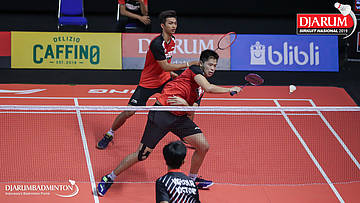 Ivan Adi Cahyono+Vincentius Suwarland (PB Djarum, Kudus) bersiap mengembalikan shuttlecock