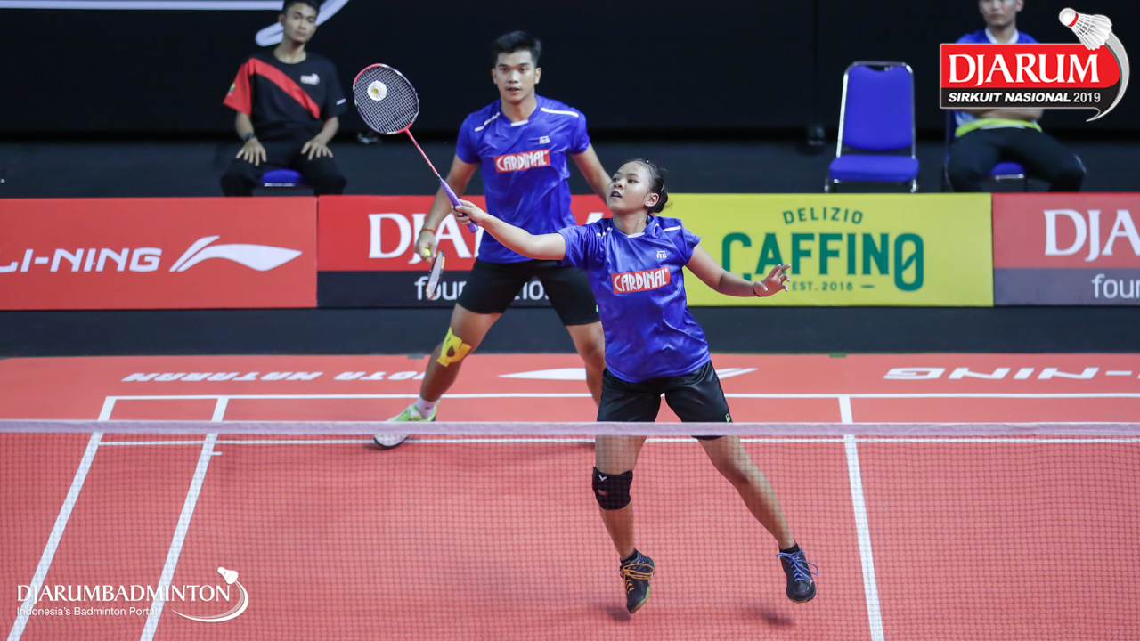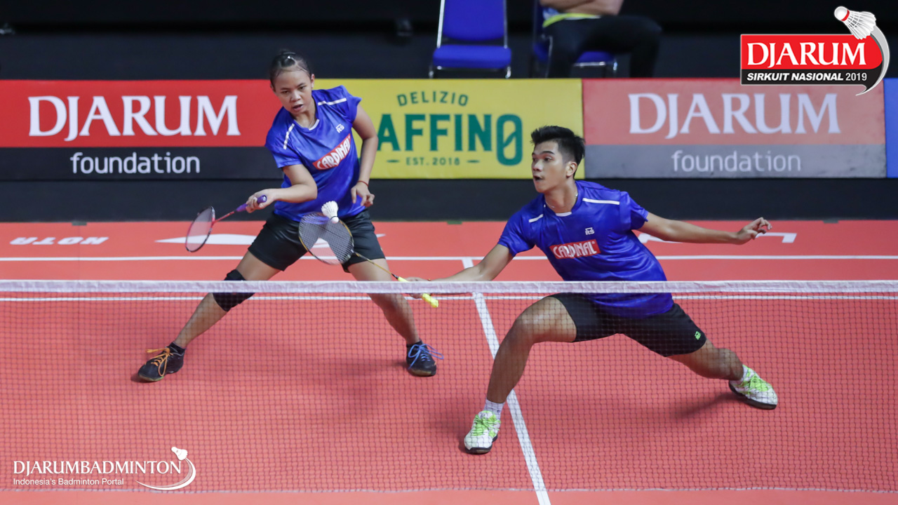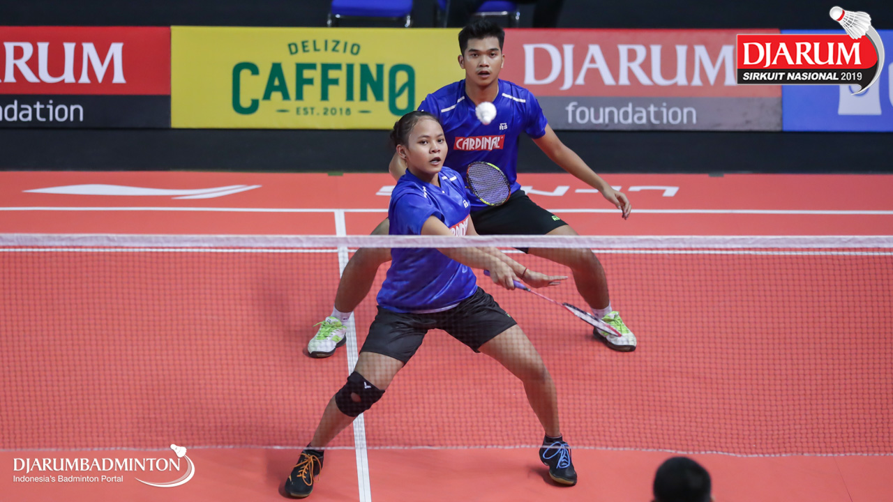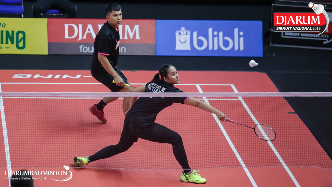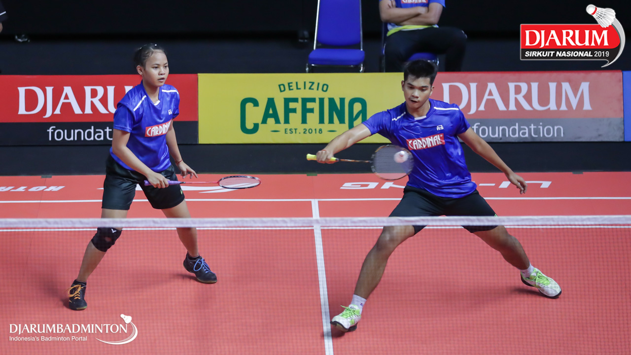 Ari Kusuma+Indira Hendzie Pramestya (Mutiara Cardinal, Bandung) mengembalikan shuttlecock