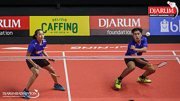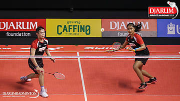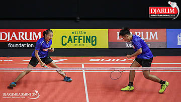 Alan Darmasaputra Kristanto+Sang Ayu Putu Kharisma Maharani (PB Djarum, Kudus) mengembalikan shuttlecock