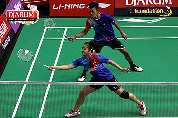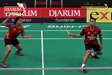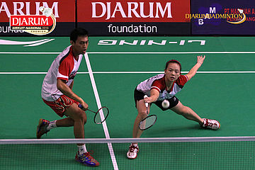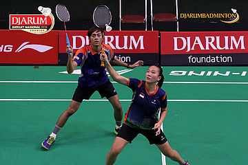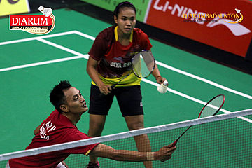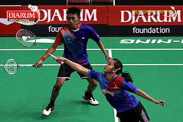 Tedi Supriadi/Della Augustia (Djarum Kudus) menghadang serangan