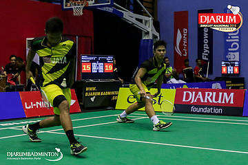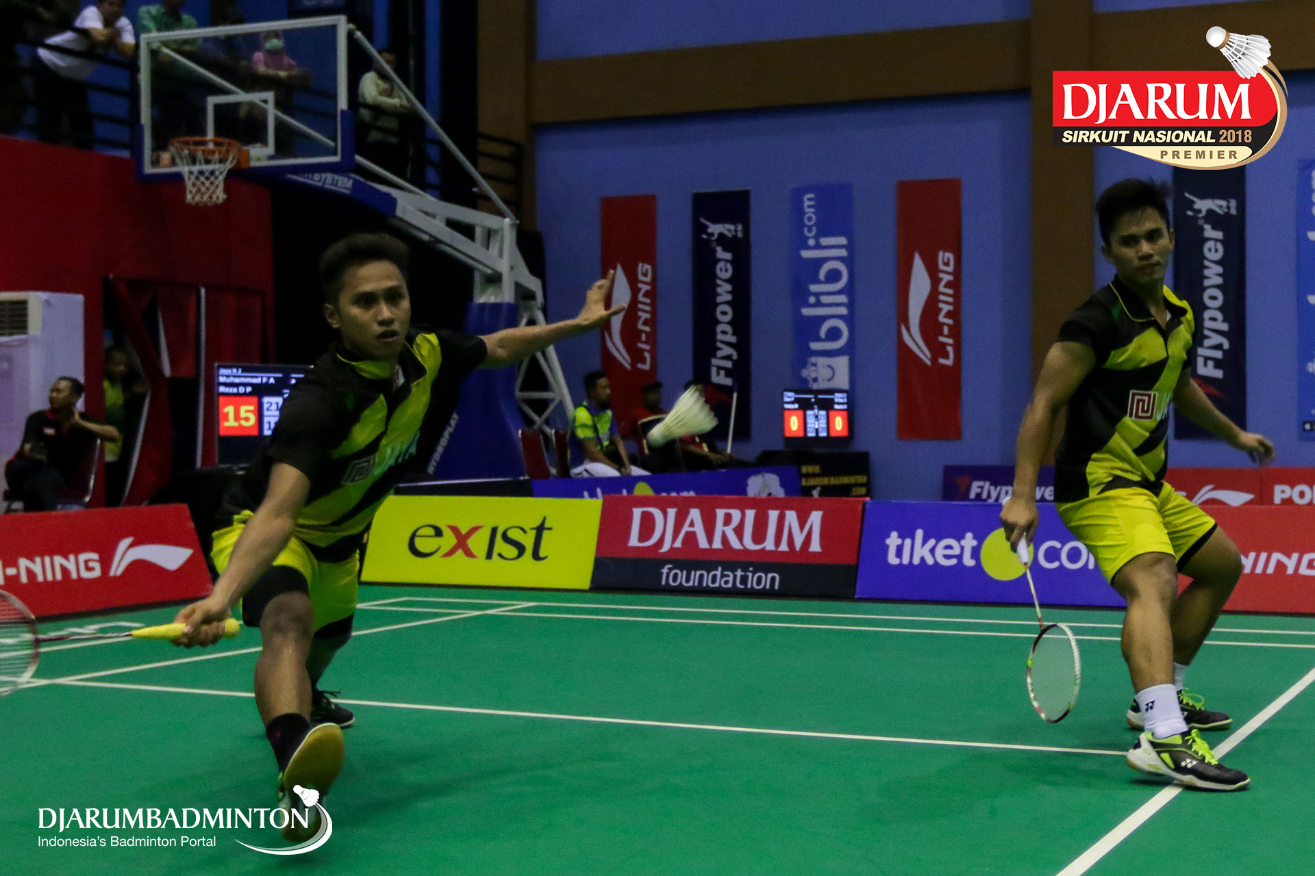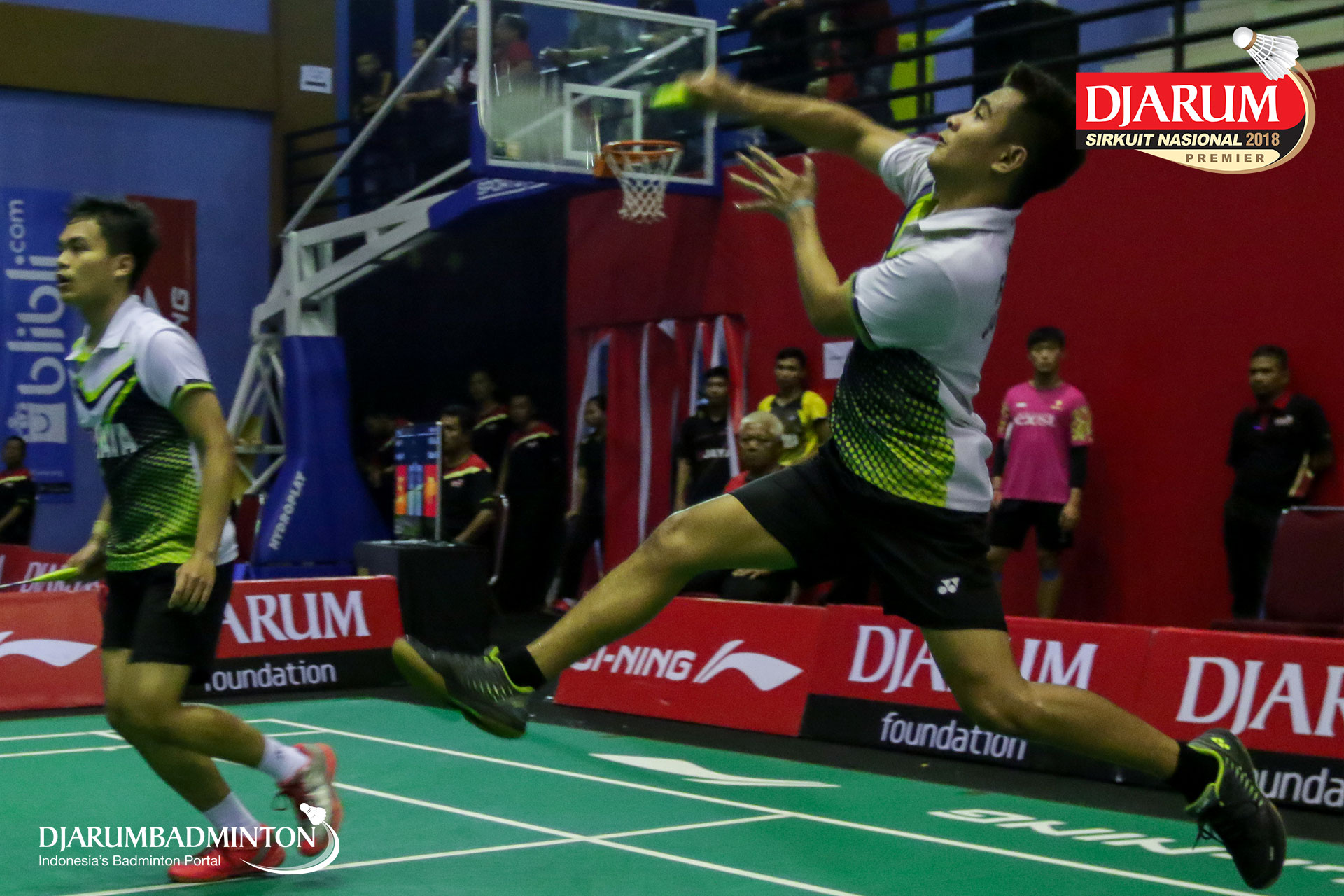 Amri Syahnawi/Rian Swastedian (Jaya Raya Jakarta, Jakpus) berusaha menyambut serangan