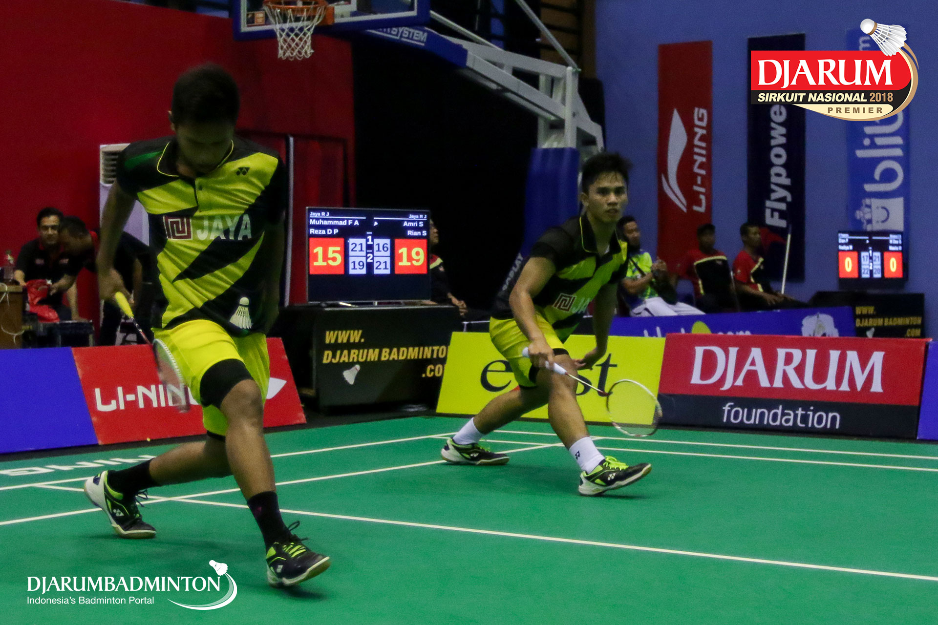 Muhammad Fachrikar Adma Parlindungan Man/Reza Dwicahya Purnama (Jaya Raya Jakarta, Jakpus) mengembalikan shuttlecock