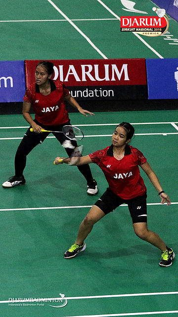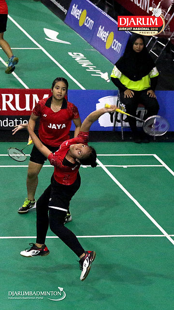 Denisa Dwi Syawaliah Budiani/Nahla Aufa Dhia Ulhaq (Jaya Raya Jakarta) Mengembalikan Shuttlecock