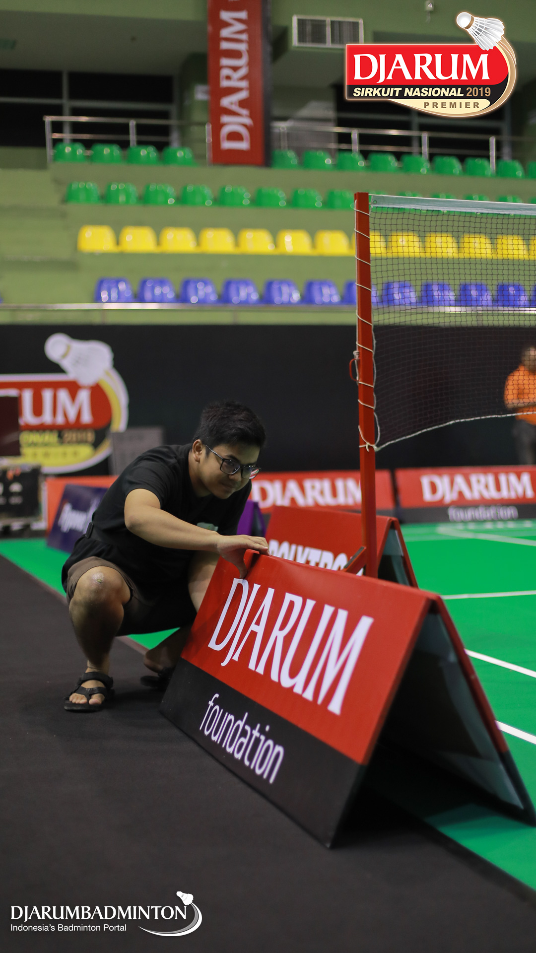 Salah satu pekerja sedang mengerjakan perlengkapan logistik Djarum Sirkuit Nasional Premier Jawa Barat Open 2019
