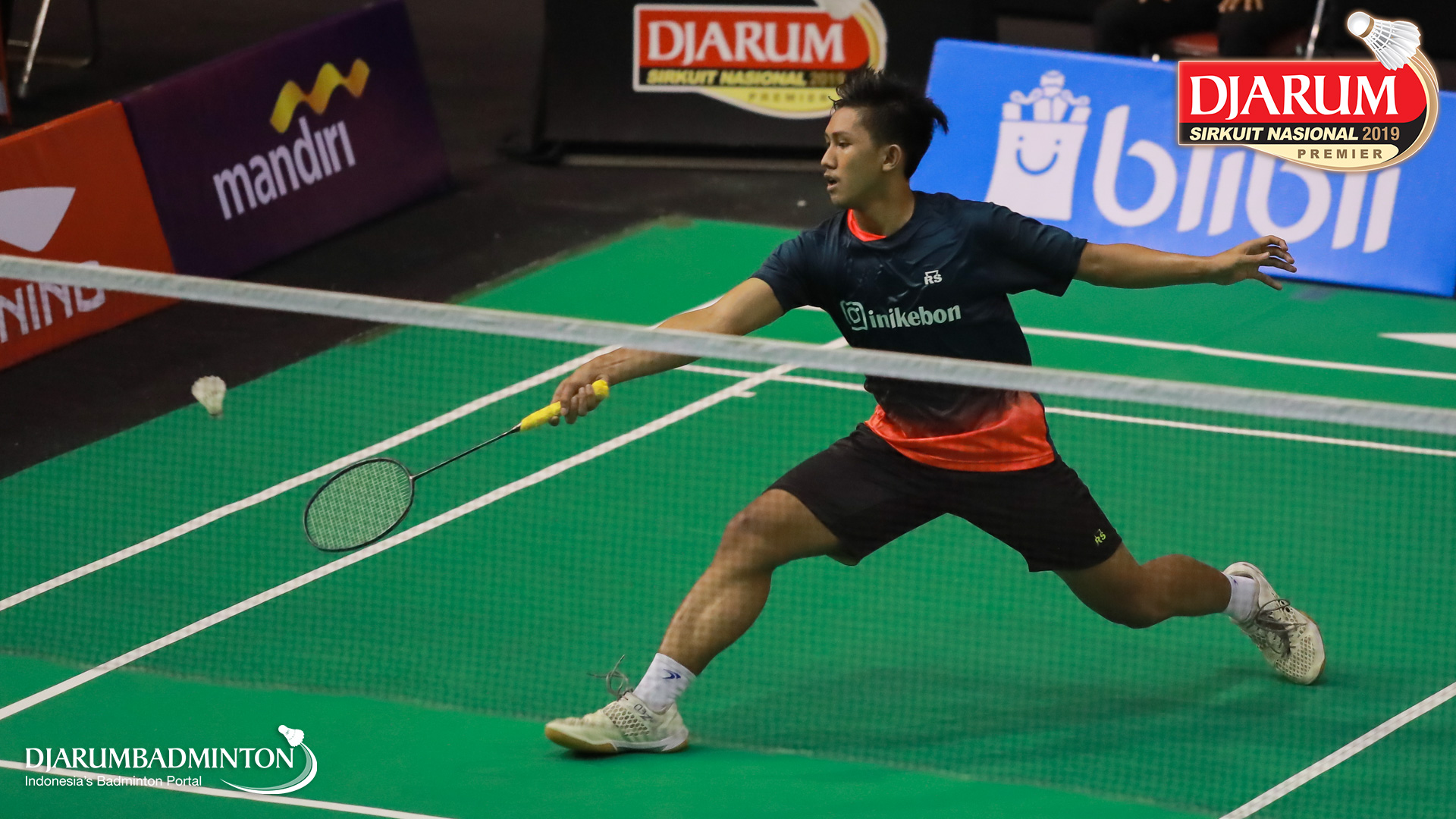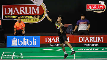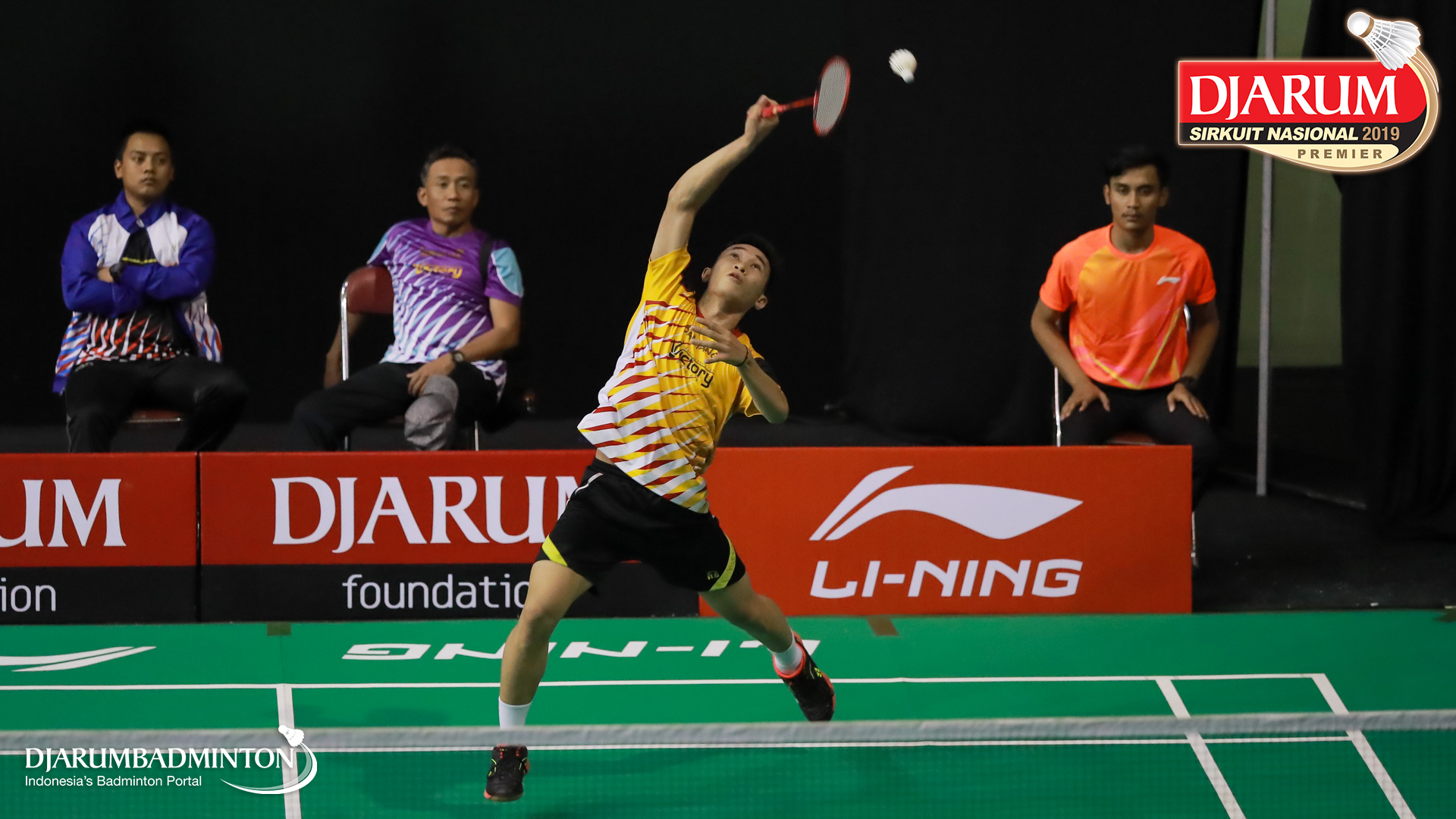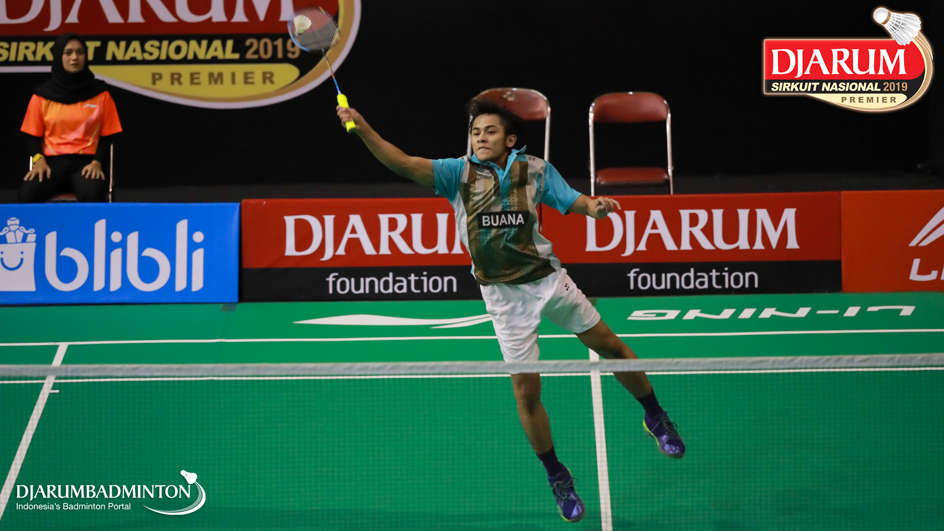 Rezha Akbar Raja Husain Ym (PB Djarum, Kudus) melepaskan serangan